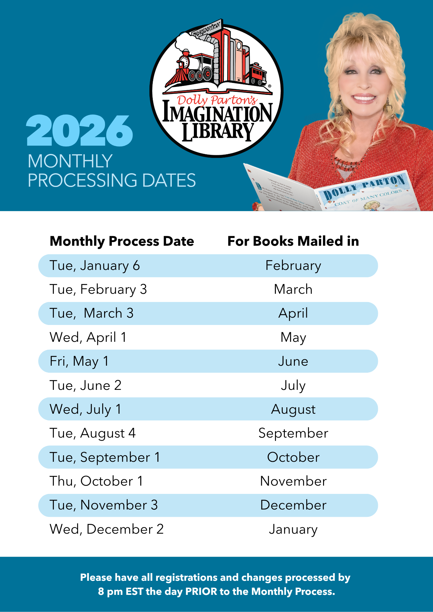 Below are the dates for the monthly processing for the calendar year 2026. These are the days we will close the book order system at 1am EST in order to pull the child data to order books to be delivered the following month. Please have all registrations entered (if using paper forms) and have pending registrations (including NCOA, transfers, parent edits, etc) processed by 8 pm EST the day prior.